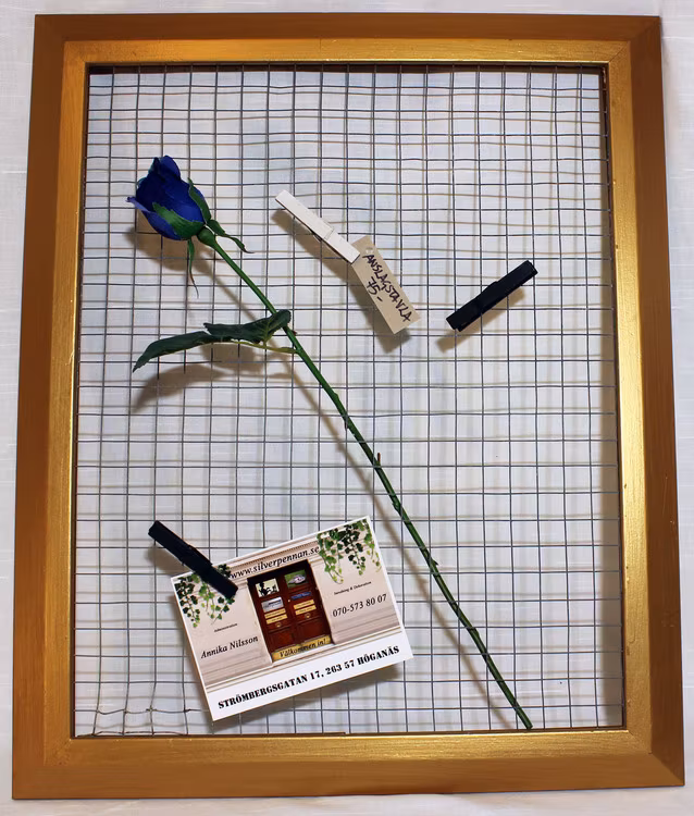Anslagstavla (gjord av tavelram) med metallnät, kopparfärgad ram