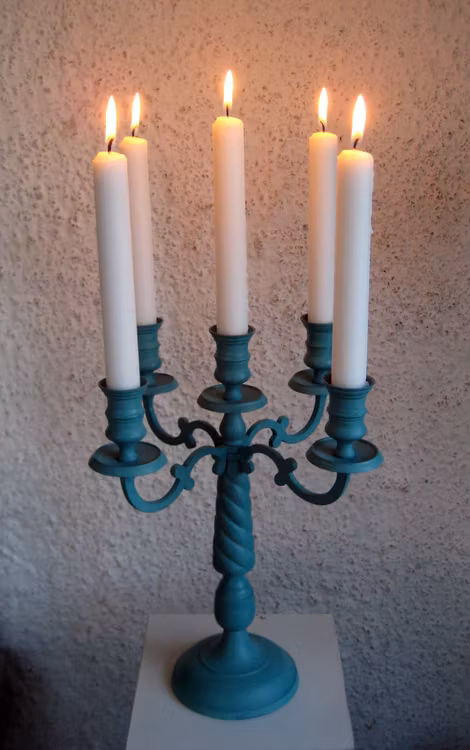 Ljusstake i metall, ommålad med kalkfärg och vaxad