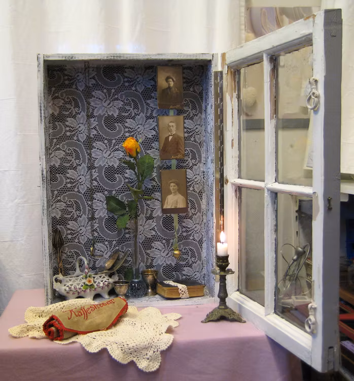 Väggskåp av gammalt fönster - för minnen och vackra saker