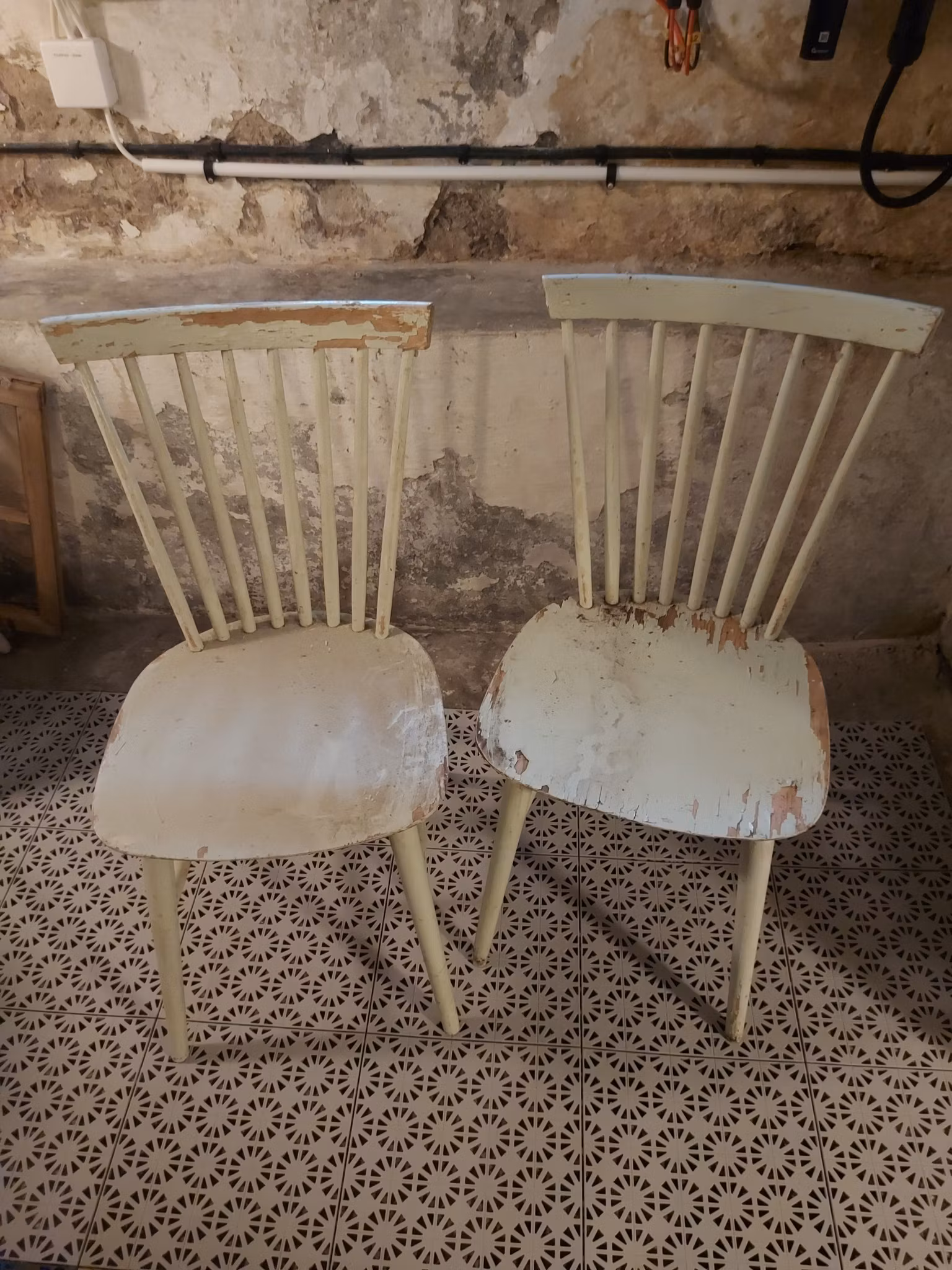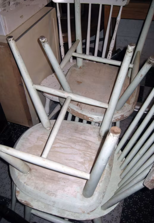 4 st gamla pinnstolar i bra skick, svagt ljusgröna, säljes tillsammans. Renoveringsbehov: faneret på sitsen, i övrigt är träet i bra skick förutom målning.