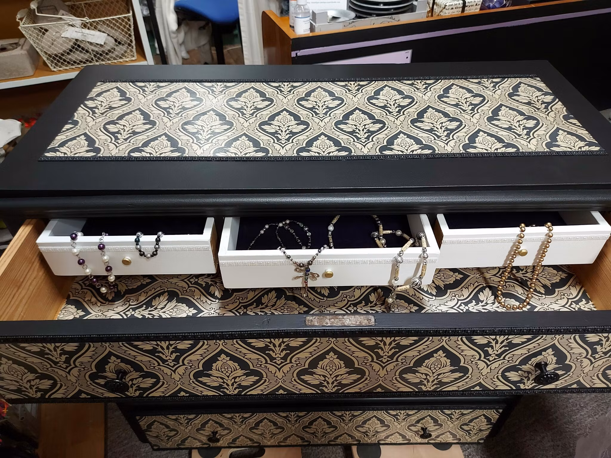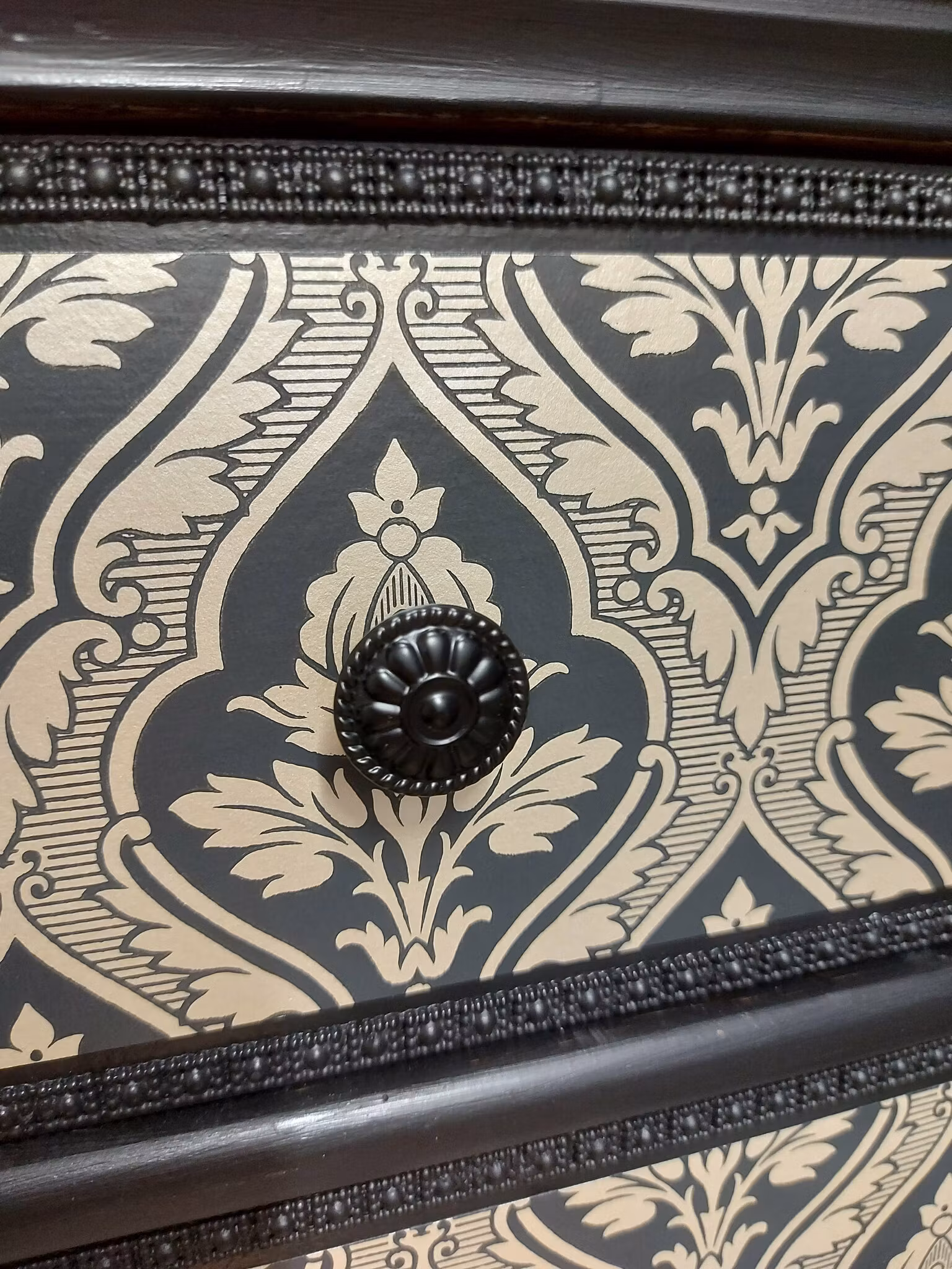 Hem › Sålda produkter › Byrå 4-lådig Byrå 4-lådig Produkten är tyvärr slut i lager. :( Byrå (från 1877) återbrukad i svart och guld, 4 lådor Mått 103x46 cm, höjd 95 cm Endast avhämtning