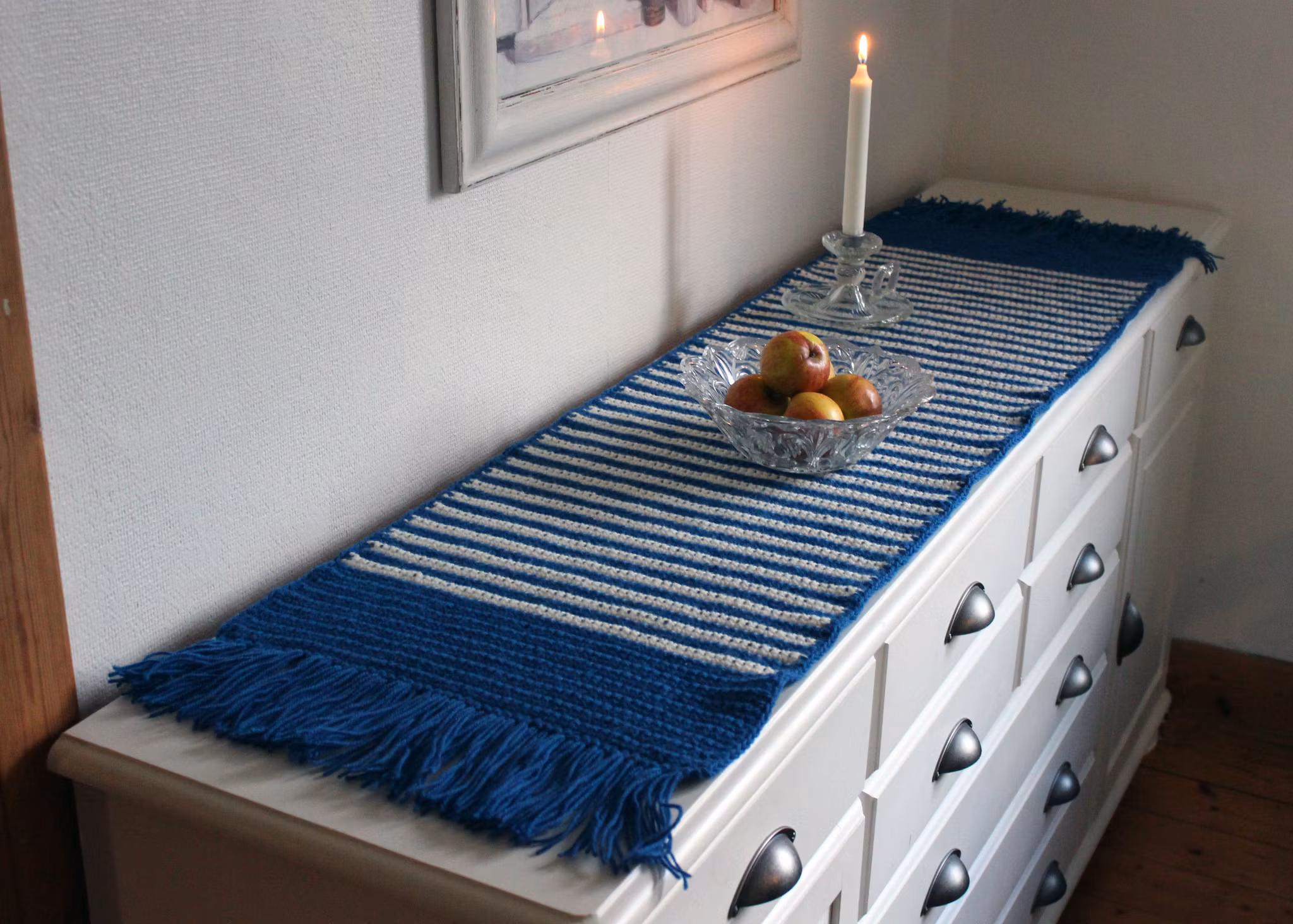 Virkad bordslöpare m frans, blå-vit, blandfärger (50%Alpaca Light + 50%Peruvian Woll)