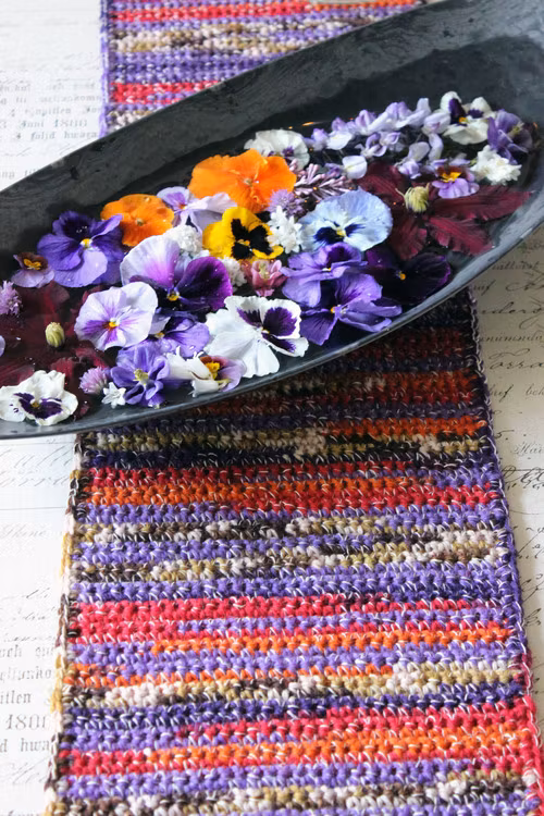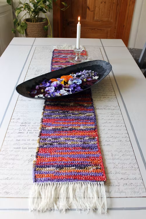 Virkad bordslöpare m frans, blandfärger (ullgarn och mattvarp)